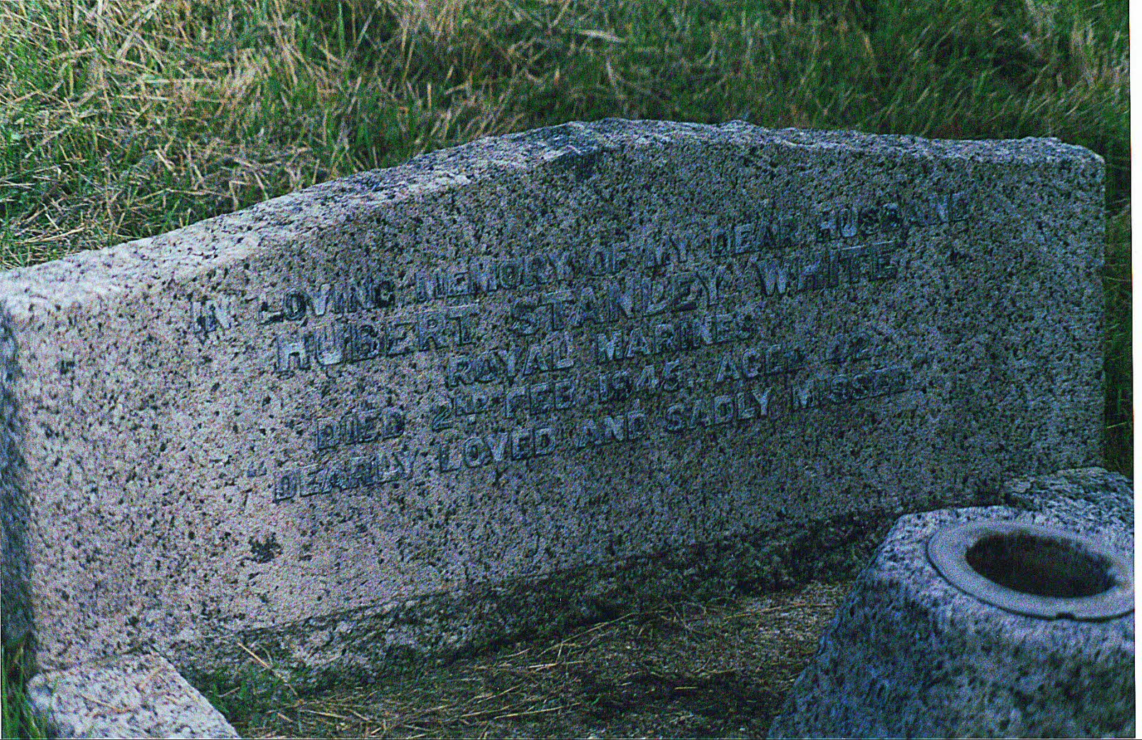 Inscription: In loving memory of my dear husband - Hubert Stanley White - Royal Marines. Died 2nd Feb. 1945 aged 42 - Dearly loved and sadly missed.