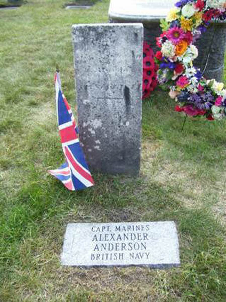 Captain Anderson has a fitting resting place lying in front of his Commanding Officer and alongside his comrades in arms from the RN and British Army. The original headstone is illegible so the local community have generously added the tablet. Inscription: Captain Alexander Anderson, Marines, British Navy