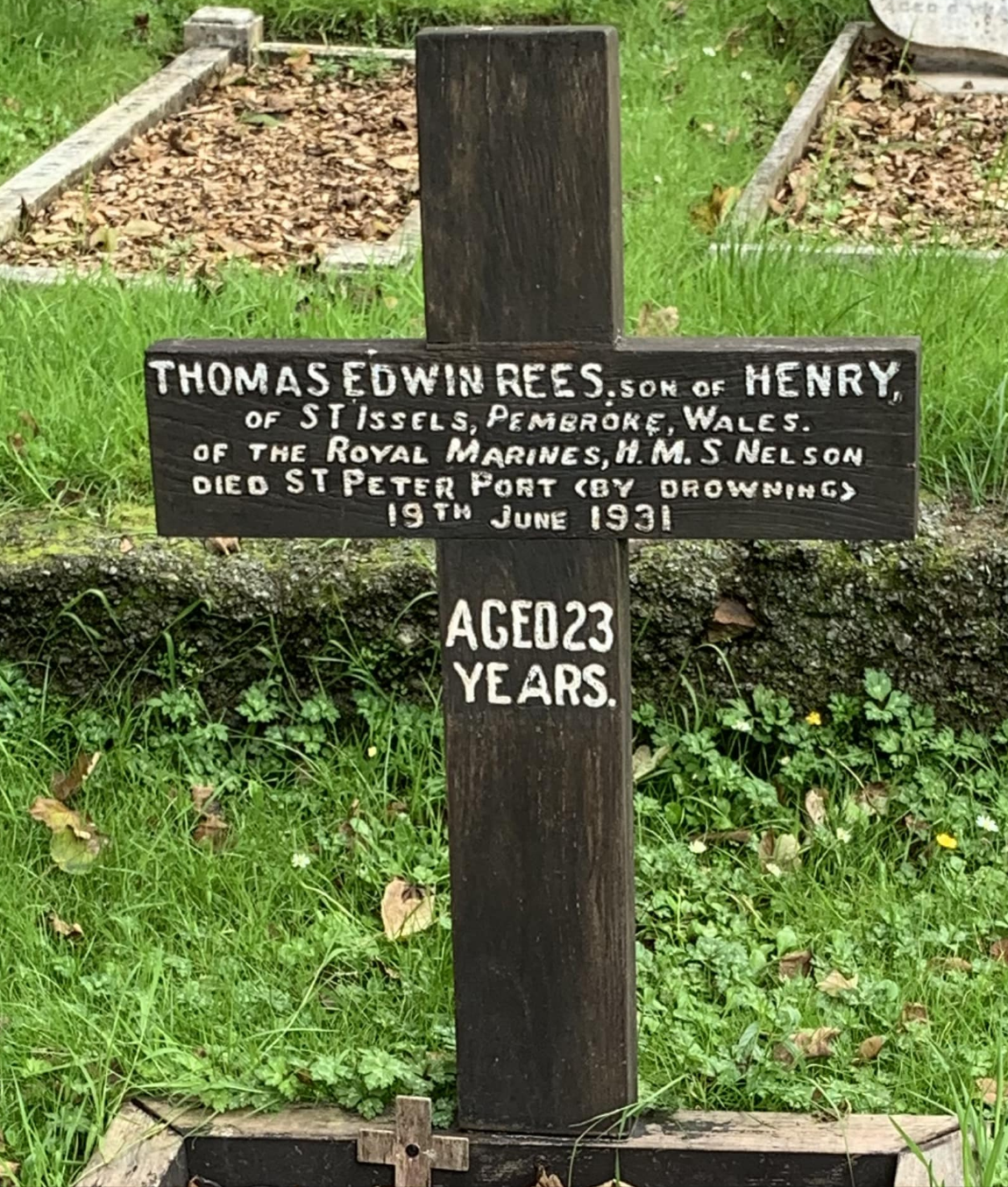 Inscription: Thomas Edwin Rees son of Henry of St. Issels, Pembroke, Wales of the Royal Marines, HMS ' Nelson', died St. Peter's Port ( by drowning ) 19th June, 1931. Aged 23 years.