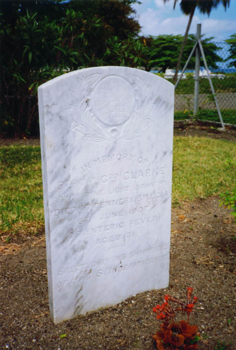 Private Clarke died at Dennery, St. Lucia, of Enteric Fever. Inscription: Erected by his shipmates of HMS 'Indefatigable'