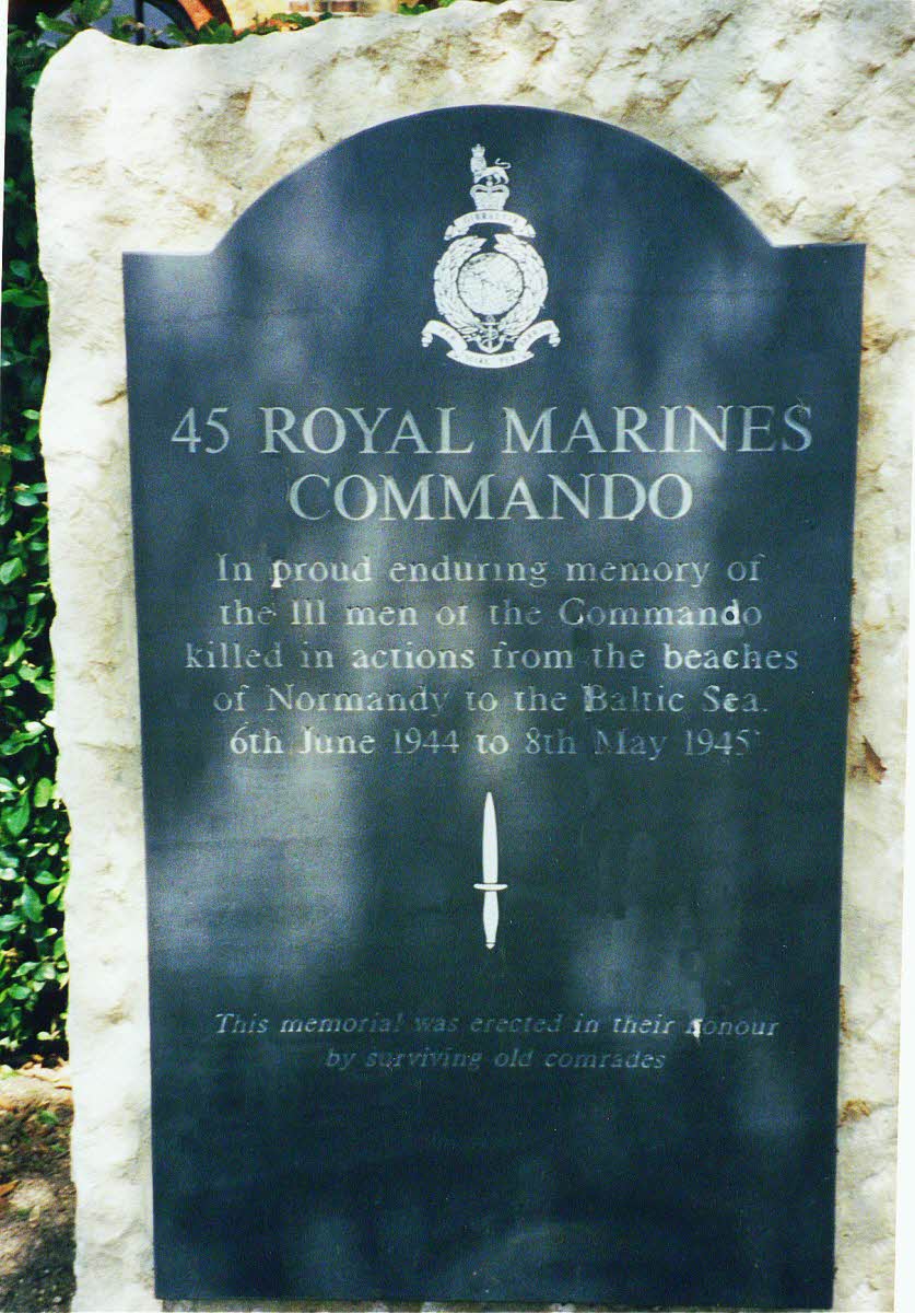 45 Royal Marines Commando. In proud enduring memory of the 111 men of the Commando killed in actions from the beaches of Normandy to the Baltic Sea. 6th June 1944 to 8th May 1945. This memorial was erected in their honour by surviving old comrades.