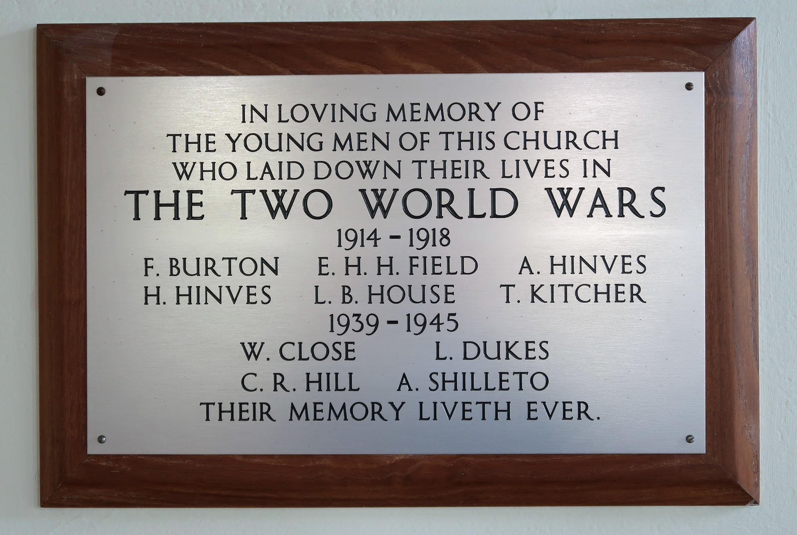 In loving memory of the young men of this Church who laid down their lives in the two World Wars. Their memory liveth ever. WW1: Includes: Field E H H